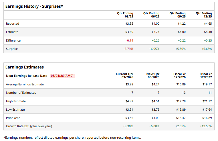 The company is slated to announce its fiscal Q1 2026 results on Monday, May 4, after the market closes. Ahead of the event, analysts expect VRTX to report an adjusted EPS of $3.88, up 9.3% from $3.55 in the year-ago quarter. It has surpassed Wall Street's bottom-line estimates in three of the past four quarterly reports while missing on another occasion.