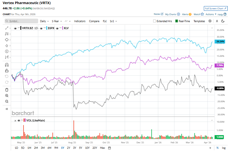 Shares of Vertex Pharmaceuticals have decreased 7.4% over the past 52 weeks, lagging behind both the S&P 500 Index's ($SPX) 25.1% gain and the State Street Health Care Select Sector SPDR ETF's (XLV) 7.6% return over the same period.