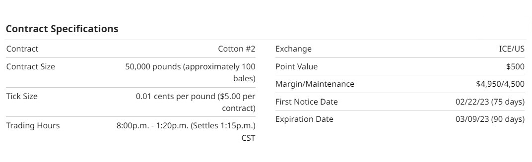 An exchange-traded note (ETN) for equity traders is available using the symbol BAL as it is indexed to one futures contract of cotton. There is no micro or mini cotton futures contracts, only the standard size cotton (KG) futures contract to trade. As always, do your due diligence before investing your money.