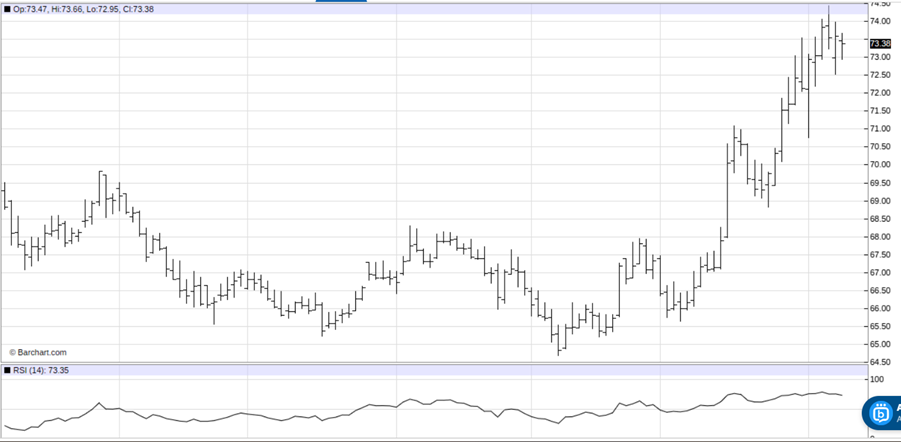See on the daily bar chart for July cotton futures that prices have just hit a multi-month high. However, there are now longer-term technical resistance layers that lie just above present prices, and which have turned back price rallies over the past couple years. Also, the relative strength index (RSI) shows the cotton market is into overbought territory (above 70.0) and is at least due for a downside correction. It’s my bias that the recent rally in the cotton market is about finished.