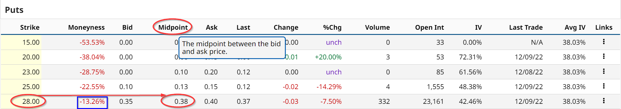 For example, the Jan. 20, 2023, puts at the $28.00 strike price offer 38 cents to the short put investor. This means that the investor puts up $2,800 in cash and/or margin with his or her brokerage firm and then “sells to open” the $28.00 strike price puts. The account will immediately receive $38 for the $2,800 investment or 1.357%.