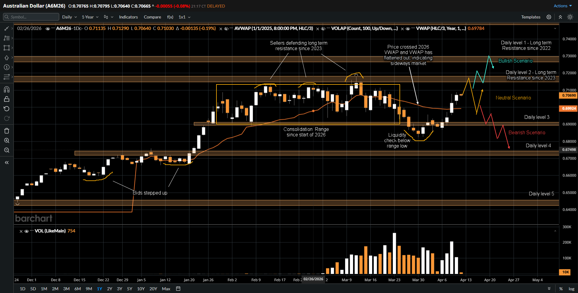 Technically, 6A sits in a well-structured consolidation between 0.69 and 0.713, with the range mid at 0.699 acting as the near-term battleground between bulls and bears. The macro backdrop remains broadly supportive for the Aussie on the policy divergence front, with the RBA having delivered two consecutive rate hikes while the Fed stays firmly on hold with little to no easing expected for the remainder of 2026. However, the Middle East conflict is the wildcard that could override any clean technical setup. The Strait of Hormuz, despite a brief opening following the April 7 ceasefire, has since been re-restricted to Iranian-linked vessels only, keeping the energy shock very much alive. A durable resolution and full reopening of the strait would likely unlock bullish momentum toward 0.713 and beyond, while a breakdown in negotiations and renewed escalation would put the 0.69 support under serious pressure. Which side of the range gives way first will tell us a great deal about where the Aussie is headed for the remainder of 2026. Watch your levels.