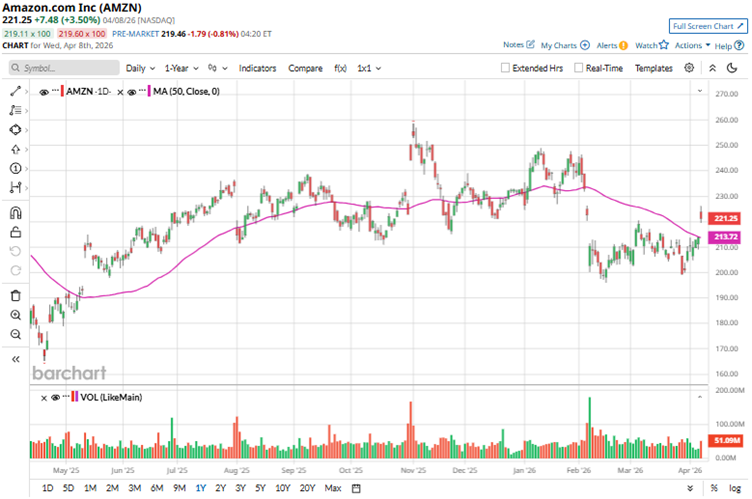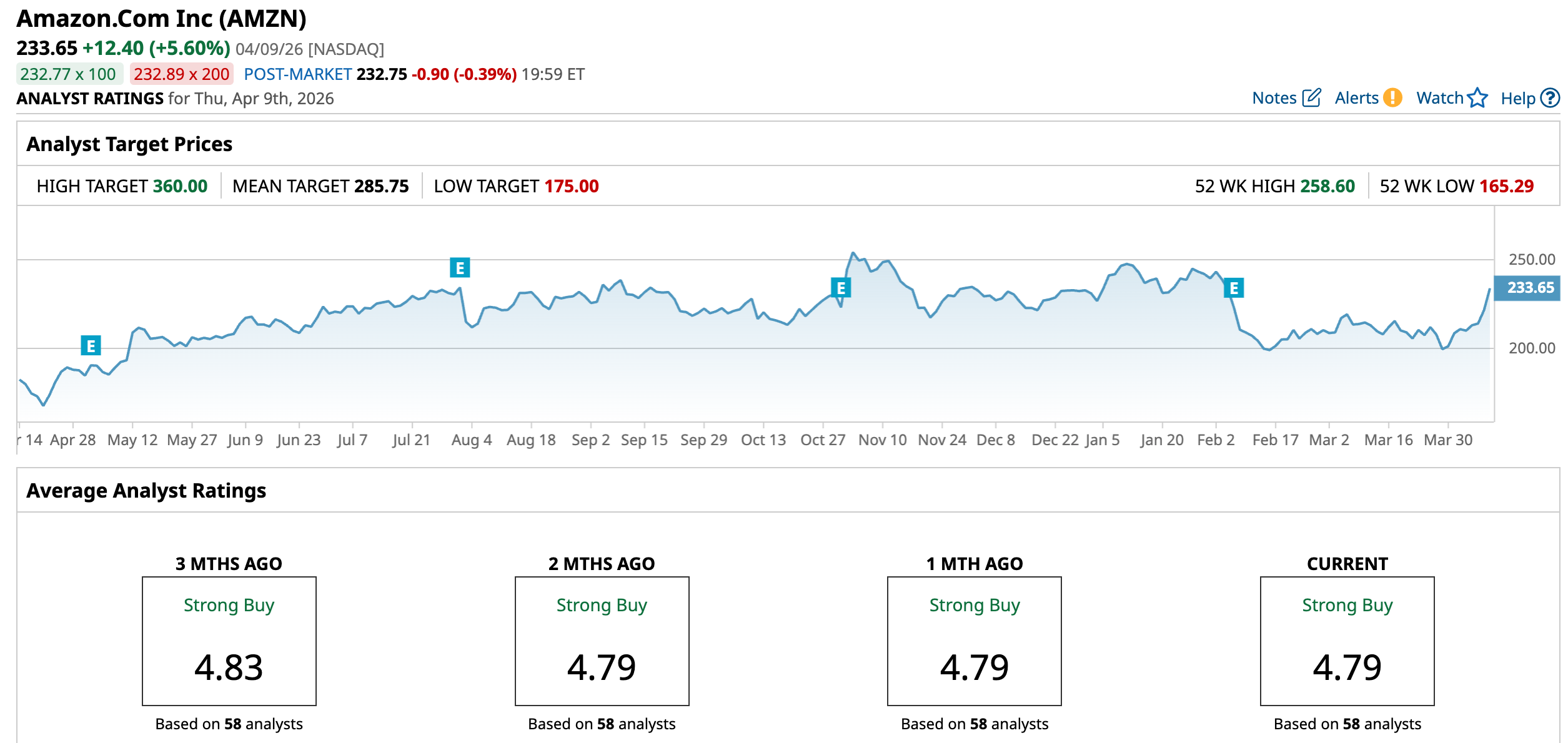 Over the past 52 weeks, Amazon’s stock has gained 22.26%. However, it has come under pressure recently as investors have been spooked by the company’s AI and cloud infrastructure spending. The shares are down 1.22% year-to-date (YTD). It had reached a 52-week high of $258.60 in Nov. 2025, but is down 9.65% from that level.