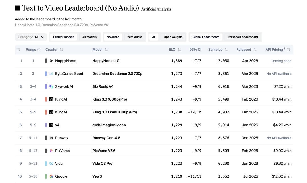SAN FRANCISCO, Calif. - April 10, 2026 - A previously unknown artificial intelligence video generator named Happy Horse 1.0 has reached the No. 1 position on the Artificial Analysis Video Arena, the leading independent benchmark for ranking AI video generation models. According to current public data, Happy Horse 1.0 holds an Elo rating of 1,374 on the text-to-video (no-audio) leaderboard, ahead of ByteDance Seed's Dreamina Seedance 2.0 720p at 1,273 — a separation of 101 points.