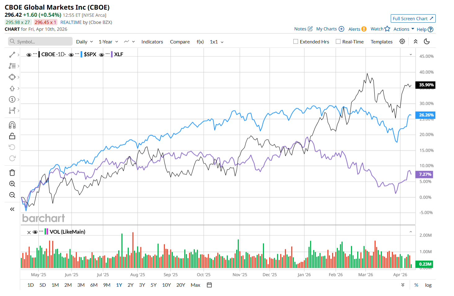 CBOE has rallied 41% over the past 52 weeks, considerably outperforming both the S&P 500 Index's ($SPX) 25.1% return and the State Street Financial Select Sector SPDR ETF’s (XLF) 11% uptick over the same time period.