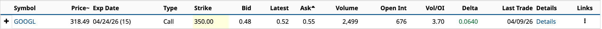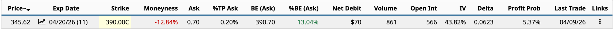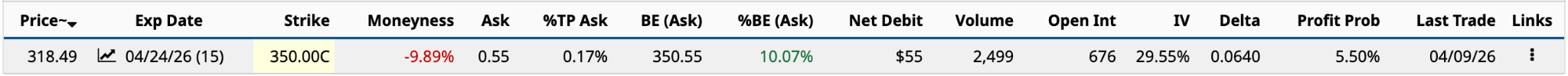 Of the three, I believe you have the best chance of making money from your Hail Mary. The April 24 $350 call has an expected move of $12.75 or 5.5% based on yesterday’s closing price. However, based on the 0.0640 delta, if the shares appreciate by $8.69 and you sell to close your call before expiration in two weeks, you’ll likely double your money.