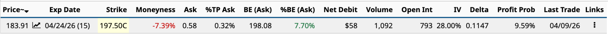 As you can see from the information above, there is a 9.59% chance that the share price on April 24 will be above the $198.08 breakeven. The expected move of $7.69 (4.18%) won’t even get you halfway there.