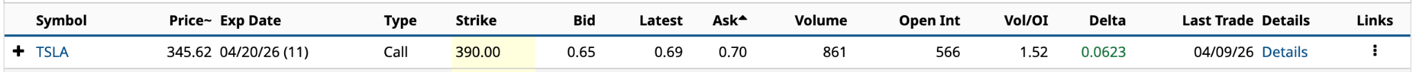 The good news is that Tesla reports Q1 2026 results on April 22, two days after the call expires. The company reported Q1 2026 deliveries on April 2. They were the weakest numbers over the past four quarters, so that bad news is already baked into the share price.