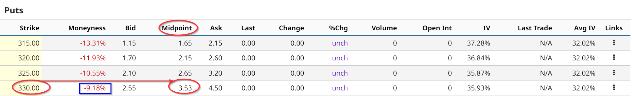 That means that the investor who puts up $33,000 in cash and/or margin with his brokerage firm, can then “Sell to Open” a put contract at $330 per share and immediately receive $353 in his account. That represents an immediate yield of 1.069%. This also works out to an annualized ROI of 12.83% if this short put exercise can be repeated each month.