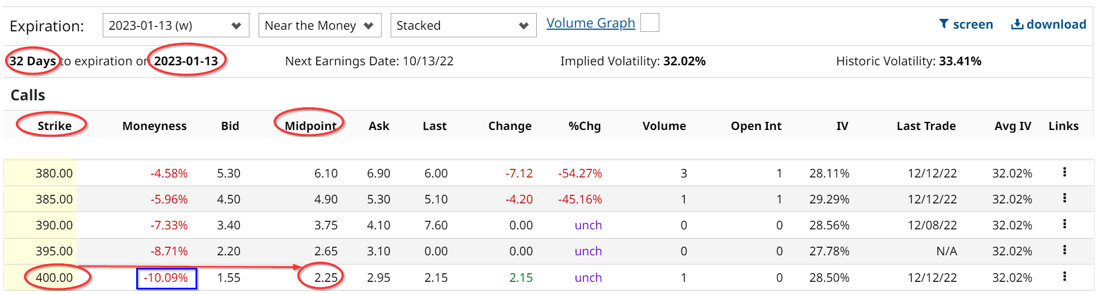 Today, the $400 strike price for one month out on Jan. 13 trades for $2.25 per call option, slightly lower than the prior call option premium. But it still means that the investor can now roll over his short call option from last month (now in a significant profit as it has no intrinsic value) to the next 30-day period.