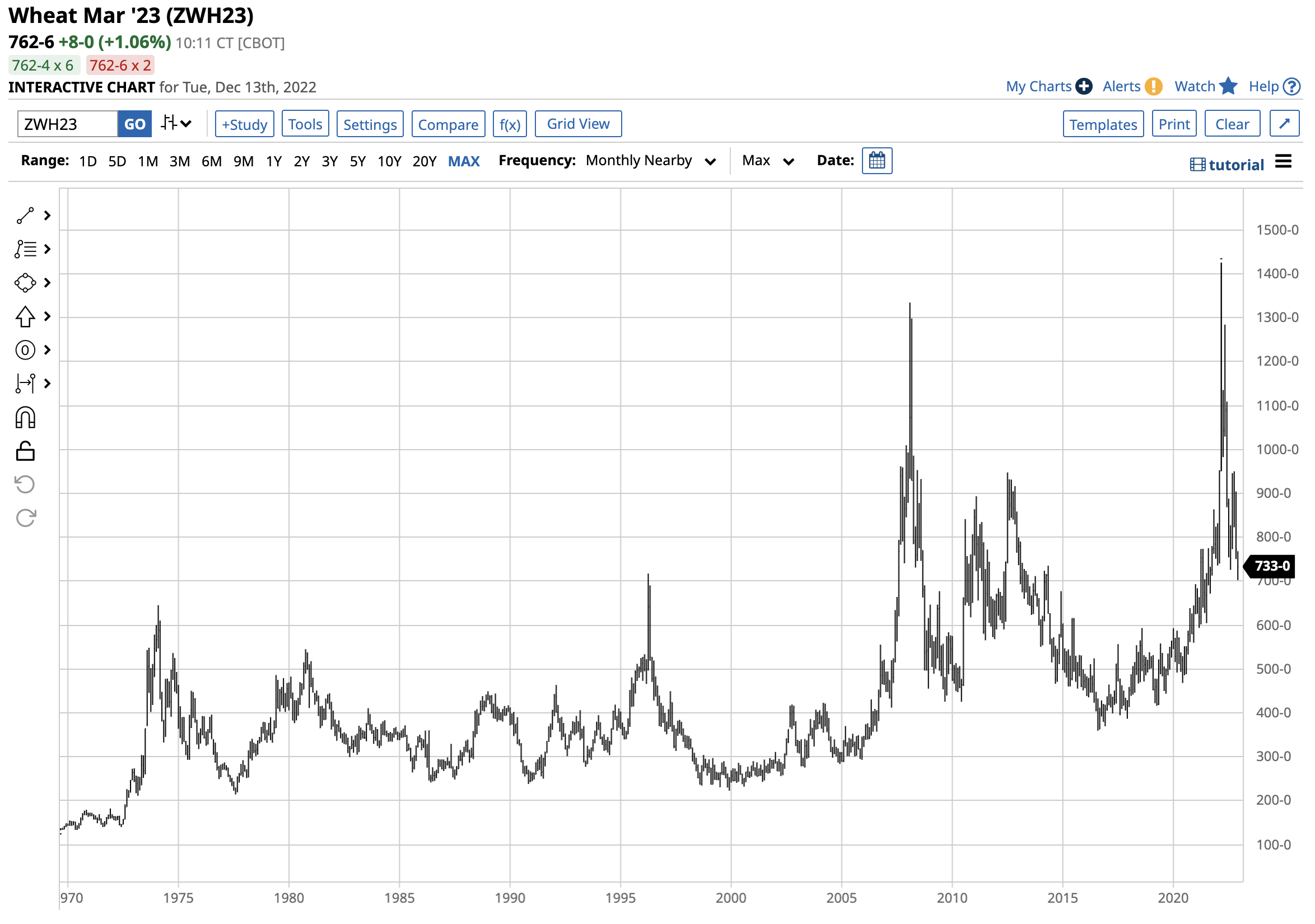 The long-term corn futures chart illustrates at over $6.50 per bushel for March delivery; corn is sitting at its highest price since 2013 in late 2022.