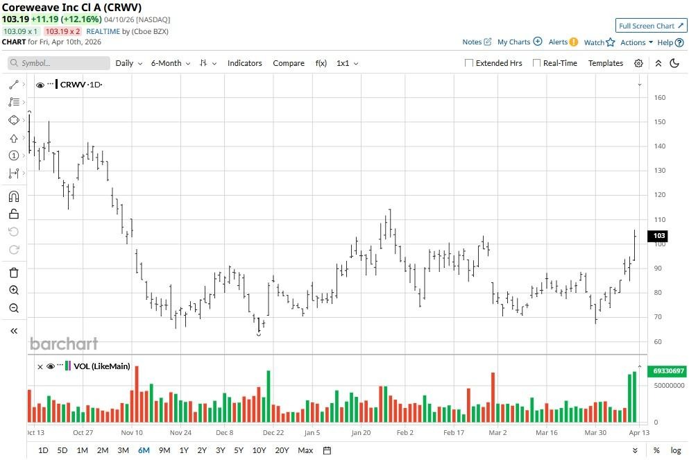 CoreWeave (CRWV) shares ripped higher on April 10 after the company announced a major multi-year cloud infrastructure agreement with Anthropic to support its Claude AI models. The news arrives only a day after META expanded its AI cloud deal with CRWV to a whopping $21 billion.