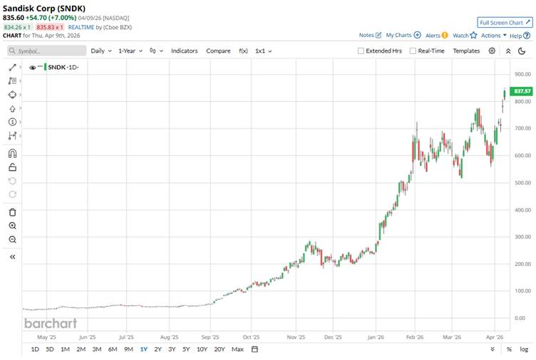 Moreover, SNDK saw a sharp leg higher following the U.S.–Iran ceasefire announcement, which alleviated geopolitical risk and triggered a broad semiconductor rally. The stock jumped 9.86% on Apr. 8, closing at around $780.90.