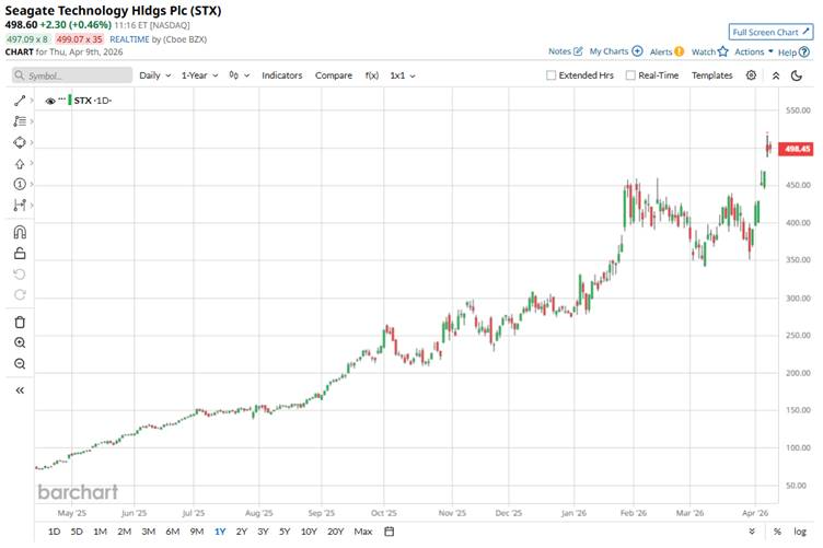 More recently, the stock extended its rally following the U.S.–Iran ceasefire announcement around Apr. 7, which eased geopolitical concerns and triggered a rotation back into semiconductor names. STX rose about 3.4% on Apr. 7, and 5.9% on Apr. 8, fueling an already hit rally. The stock has far outpaced the S&P 500 Index’s ($SPX) 29.45% returns over the past year and 0.38% decline this year.