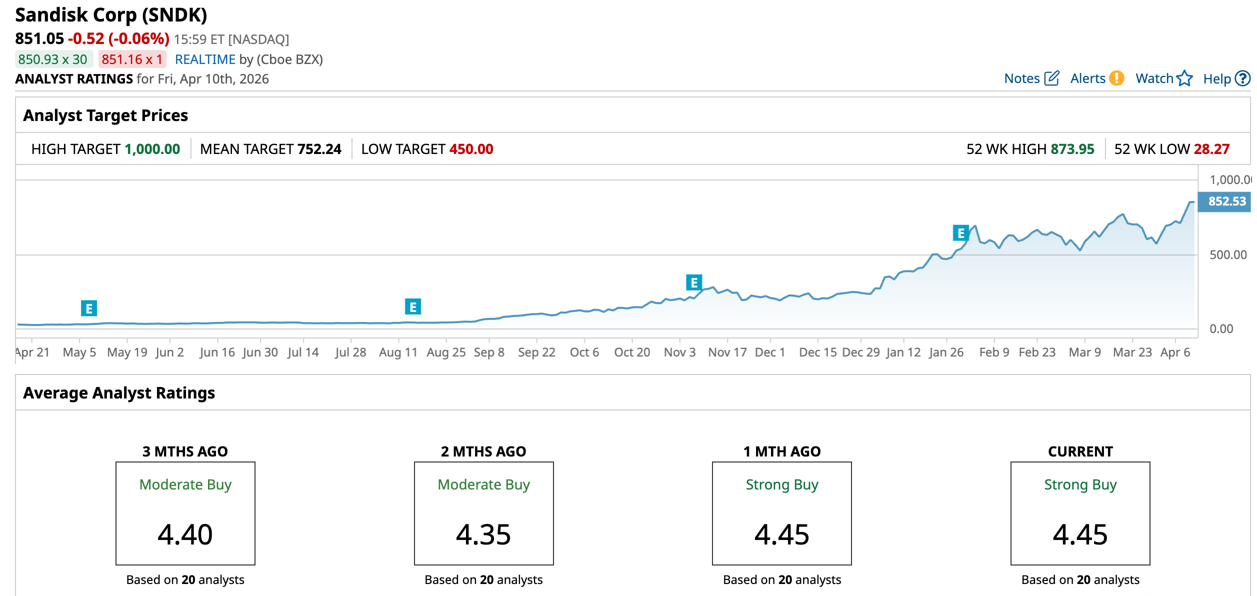 SNDK has already surged past its average analyst price target of $752.24, while the Street-high target of $1,000 suggests that the stock could surge as much as 17.5%.