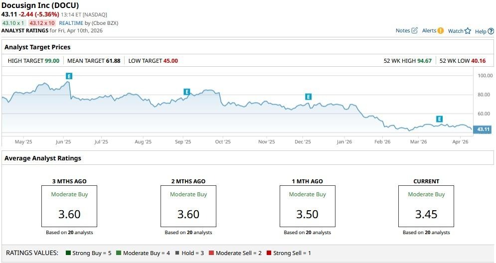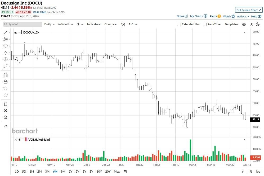 DocuSign stock has been a major laggard in 2026, currently down nearly 40% versus its year-to-date high.