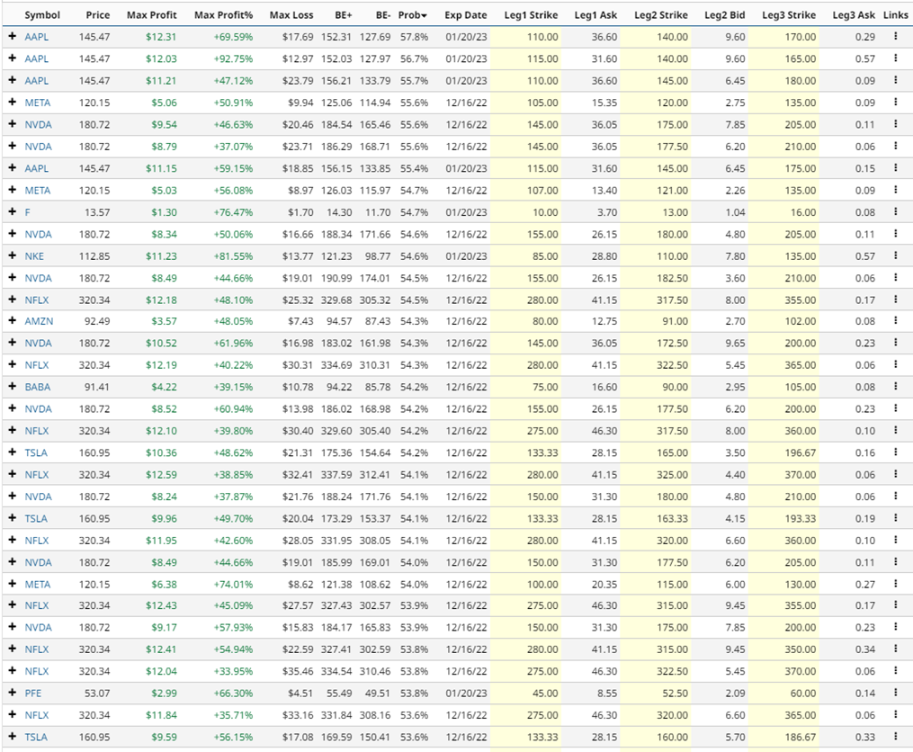 The screener shows some interesting long call butterfly trades on popular stocks such as AAPL, META, F, NVDA, NFLX and TSLA.