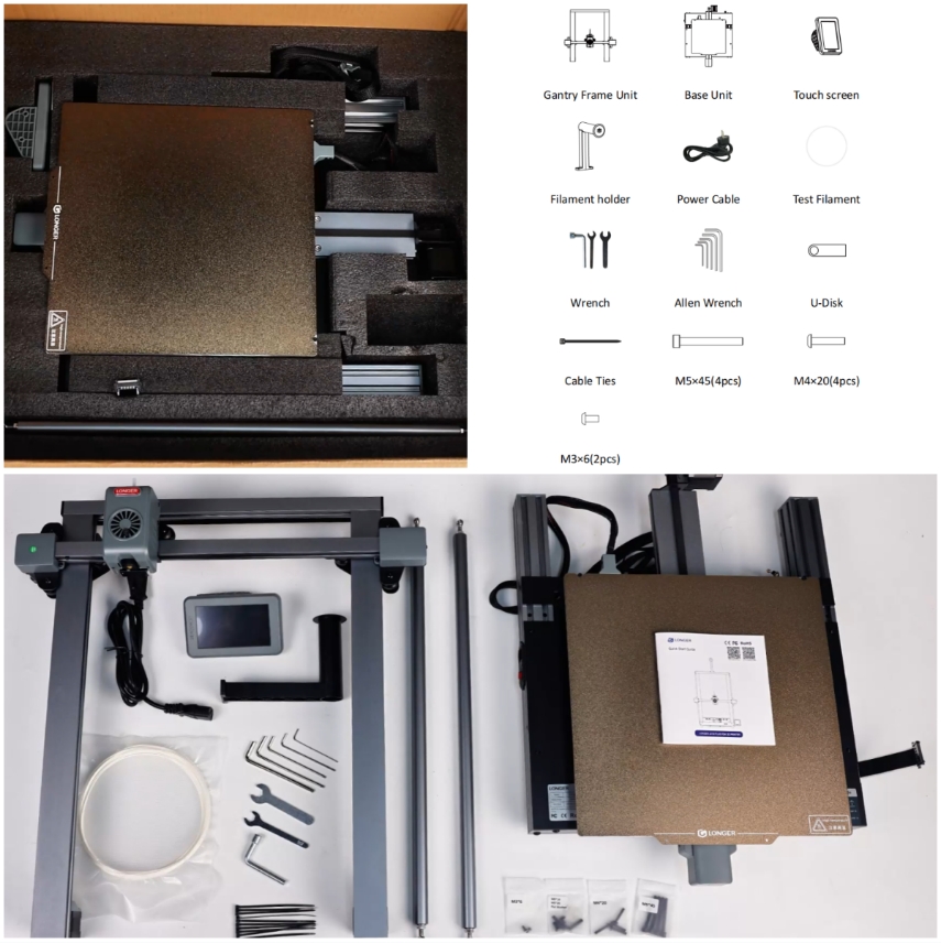 Inside the box are the gantry frame, base unit, 4.3-inch touchscreen, filament holder, power cable, sample filament, tool kit, USB drive, and installation screws. The instruction manual provides clear illustrations, making the setup process easy even for first-time FDM 3D printer users.