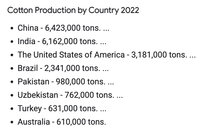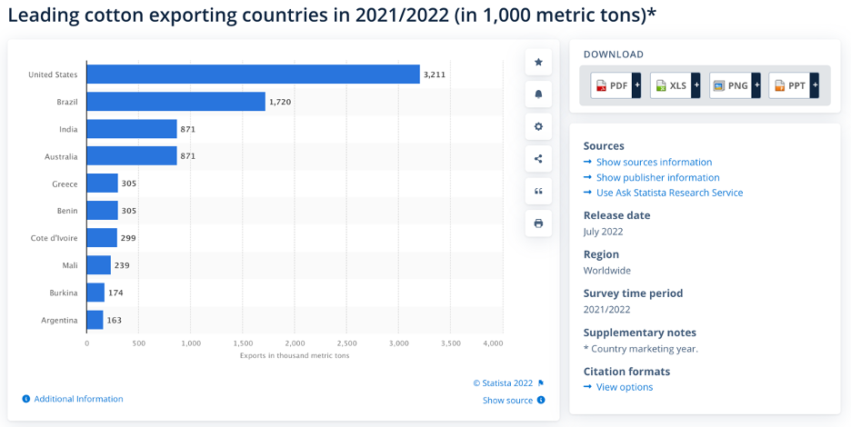 The chart highlighting cotton consumption in 2022 shows that China, India, Pakistan, Bangladesh, Turkey, and Viet Nam are the leading consumers. When Chinese and Indian production decline, these countries turn to the U.S., Brazil, and Australia for supplies.