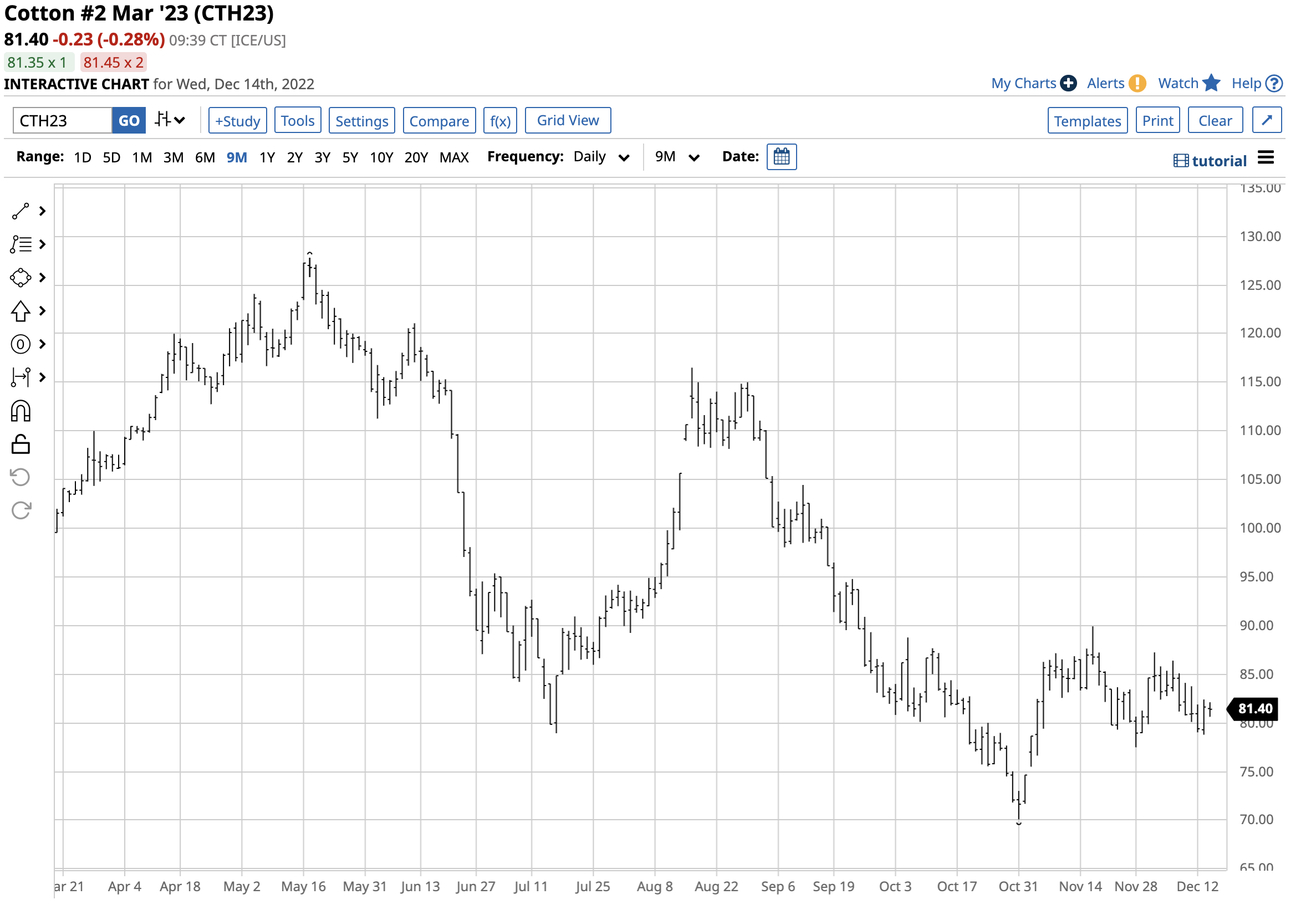 The active month March 2023 futures contract chart shows that after falling to 70.10 cents in October, March cotton futures have consolidated between 77.50 and just below 90.0 cents per pound since early November.