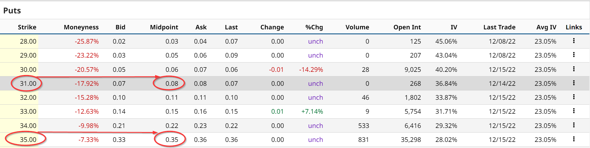 The Barchart Jan. 20 option chain shows that the $35 strike price puts trade for 35 cents per put contract, as seen below.