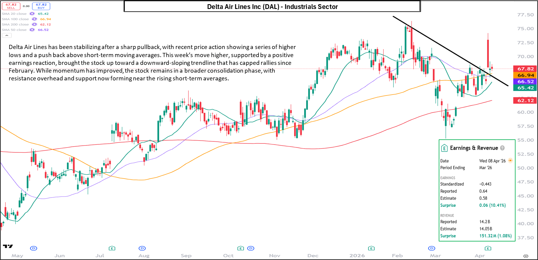 Following a strong advance earlier in the year, DAL has transitioned into a consolidation phase. Price has stabilized near its short-term moving averages after a brief pullback, while a downward-sloping trendline from recent highs continues to define near-term resistance.