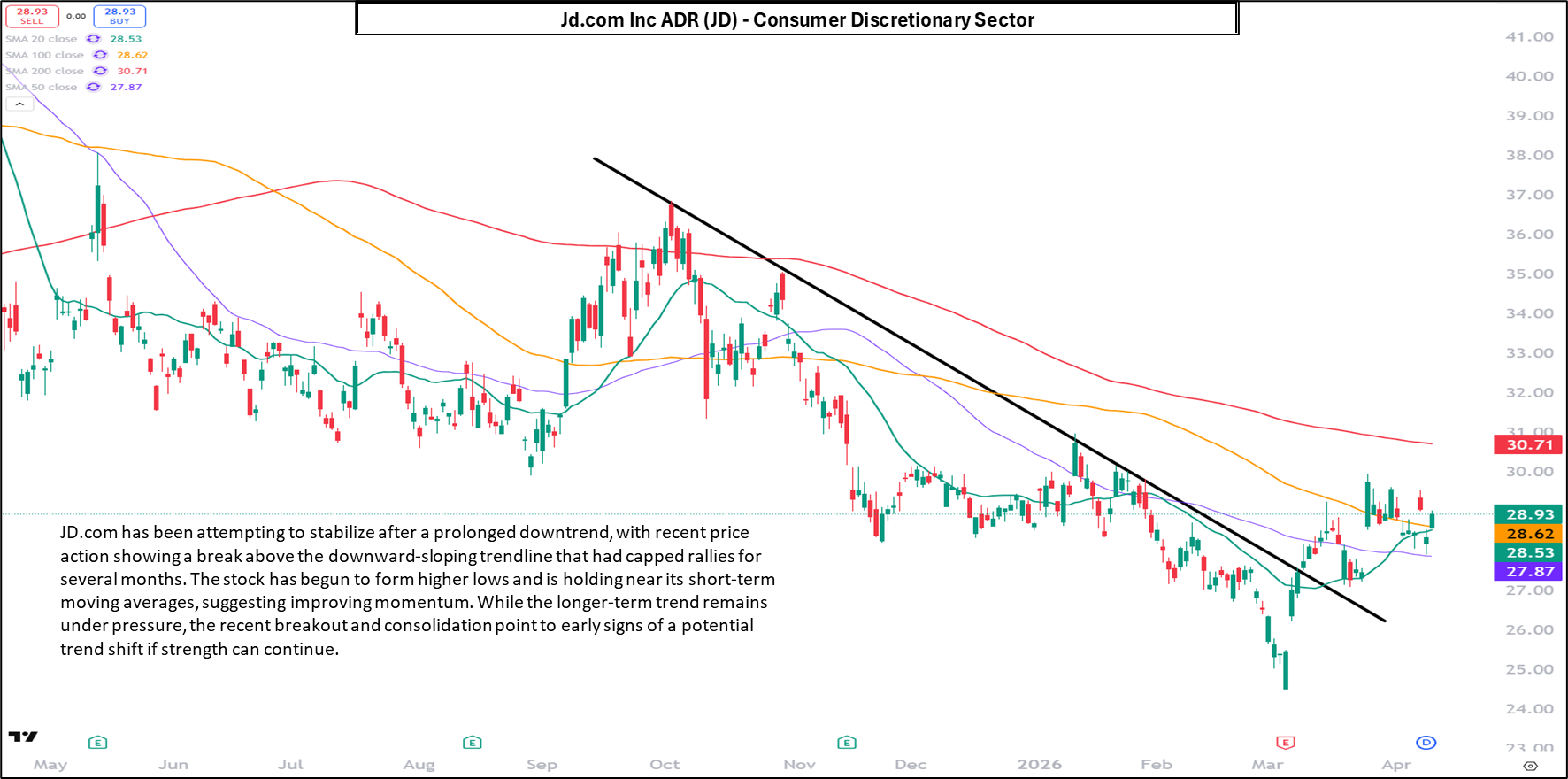 JD.com presents a different setup, but one that is equally relevant. The stock has been in a prolonged downtrend, with rallies consistently capped by a downward-sloping trendline.