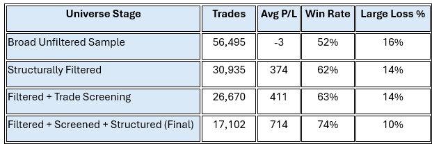 The improvement is not driven by trade management. It is driven by removal. As weaker configurations are eliminated: