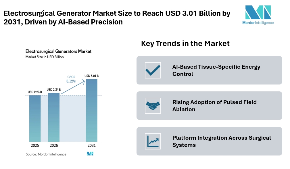 According to Mordor Intelligence, the electrosurgical generator market size is estimated at USD 2.34 billion in 2026, growing from USD 2.23 billion in 2025, and projected to reach USD 3.01 billion by 2031, at a CAGR of 5.12% during the forecast period. This reflects stable market growth, supported by rising surgical volumes and increasing adoption of minimally invasive procedures.