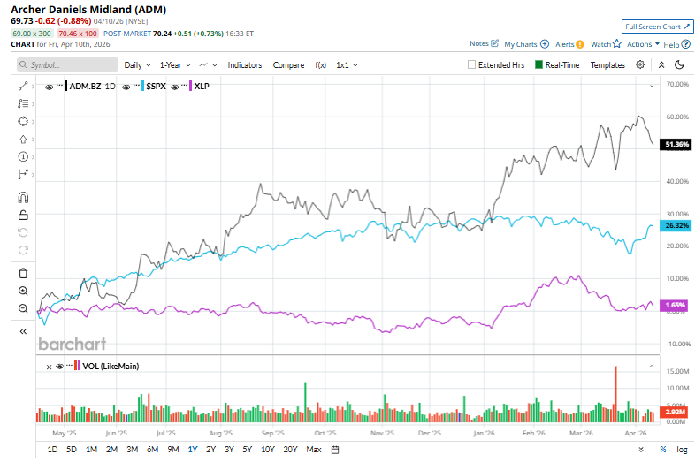 ADM has soared 56.8% over the past 52 weeks, outperforming the S&P 500 Index’s ($SPX) 29.4% gains and the Consumer Staples Select Sector SPDR Fund’s (XLP) 3.8% rise during the same time frame.
