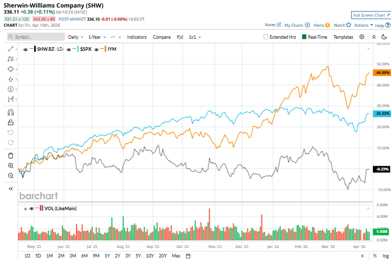 Sherwin-Williams stock has lagged the broader market over the past year, with 1.9% gain, while the S&P 500 Index ($SPX) has surged 29.4%. The stock has also underperformed the iShares U.S. Basic Materials ETF (IYM), which posted an 51.4% gain over the same 52-week period.