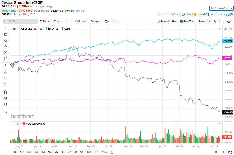 CSGP stock has dwindled 51.6% over the past year, underperforming the S&P 500 Index’s ($SPX) 29.4% gains and the State Street Real Estate Select Sector SPDR Fund’s (XLRE) 11.6% gains over the same time frame.