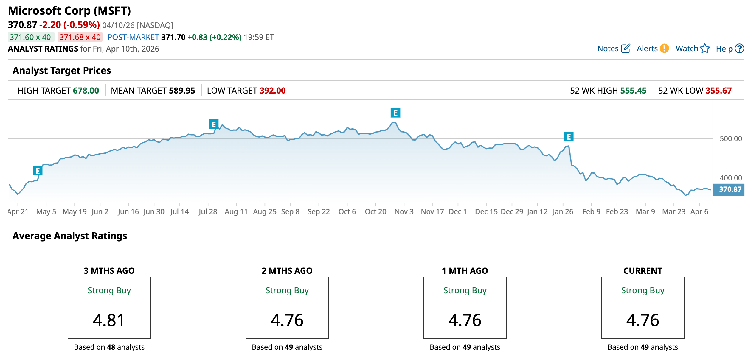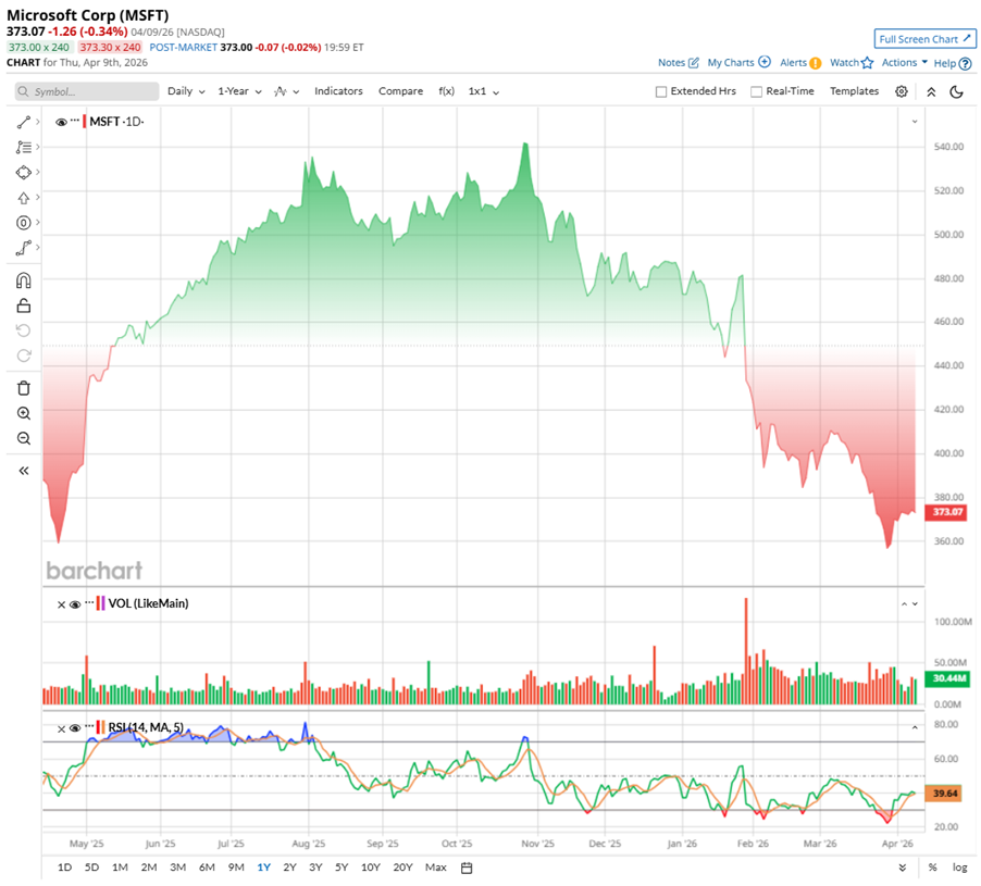 But the recent stretch tells a different story. The stock is down about 2.75% over the past 52 weeks, with a sharper drop of nearly 27.42% in the last six months. In 2026 alone, shares have fallen roughly 23.31% year-to-date (YTD. In fact, on March 30, MSFT was hovering near its 52-week low.