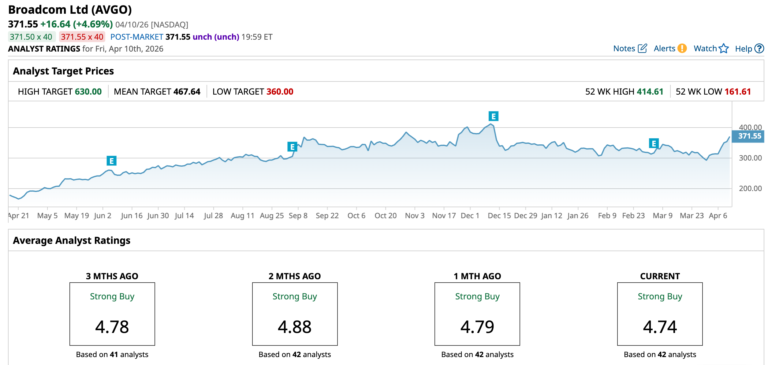 AVGO’s average target of $467.64 suggests an upside potential of 25.86% from the current price levels. The Street’s highest $630 price target hints the stock could rally as much as 69.56%.