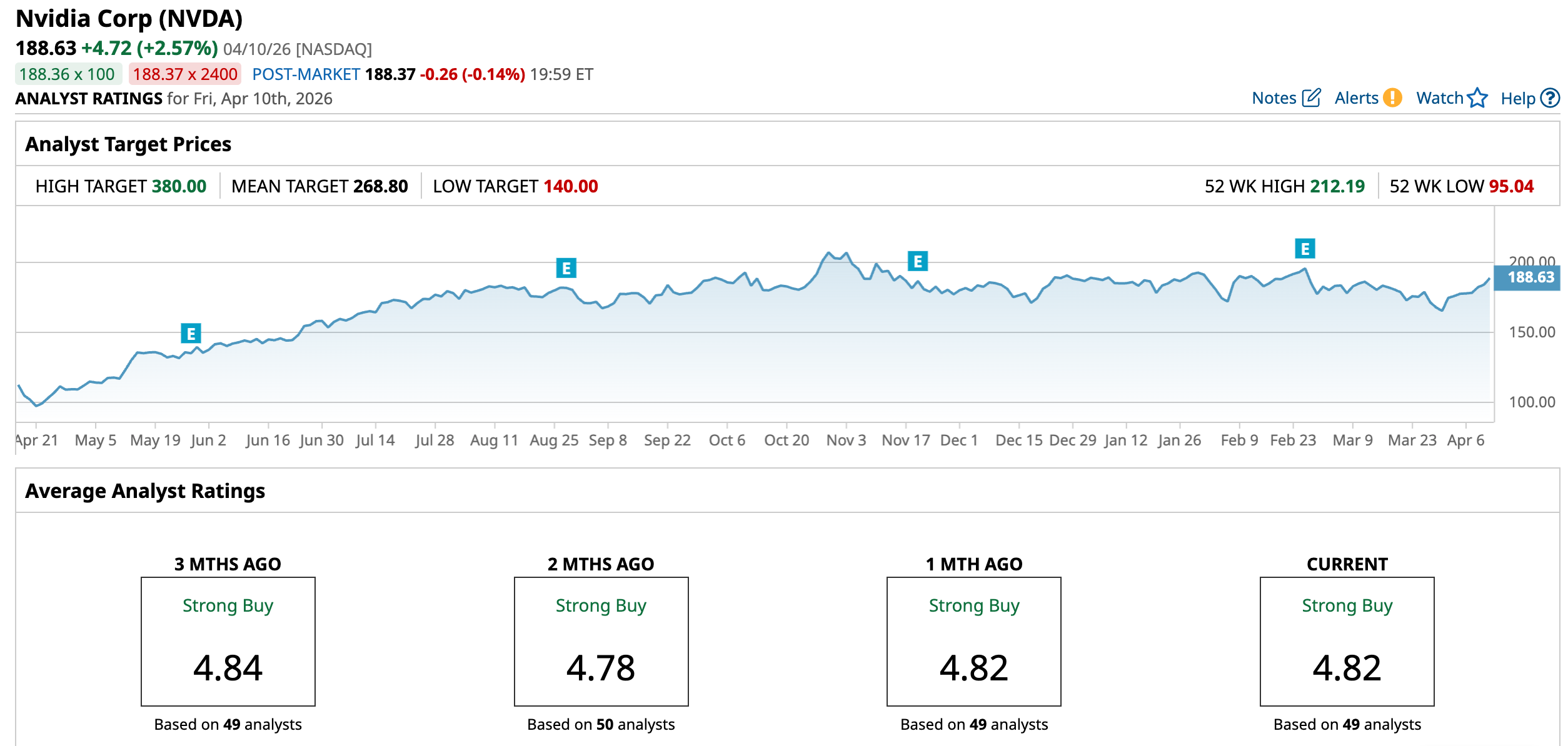 The average analyst price target for NVDA is $268.80, indicating potential upside of 42.5%. The Street-high target price of $380 suggests that the stock could rally as much as 101.5% from here.