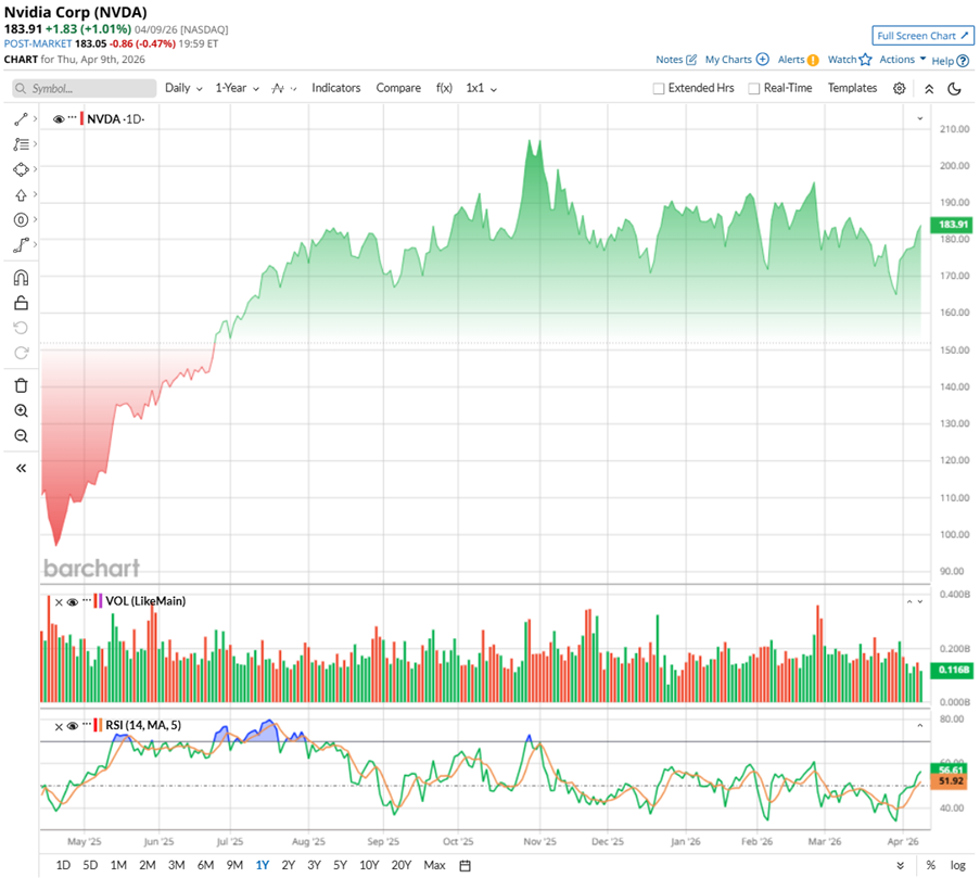 Shares of NVIDIA have moved in a start-stop pattern over the past year, rising sharply and then pausing before the next leg up. The stock hit new highs 44 times in 52 weeks, peaking at $212.19 in October before pulling back about 11%. Even with that dip, the stock is still up roughly 75.36% over the past 52 weeks.
