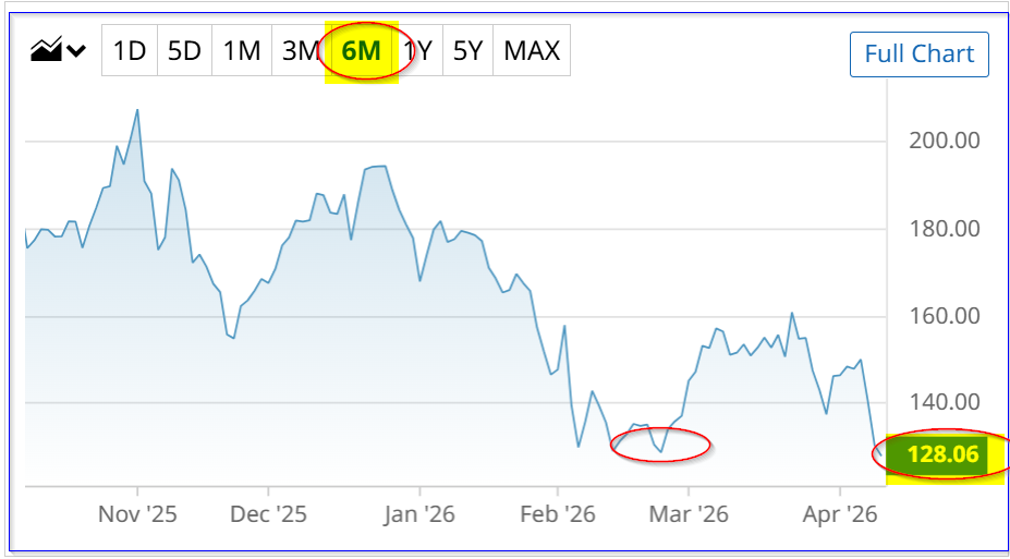 PLTR closed down at $128.06 on Friday, April 10. That's below the prior 6-month low of $128.84 on Feb. 28. Earnings are due out on May 4, so PLTR could move higher ahead of its results.