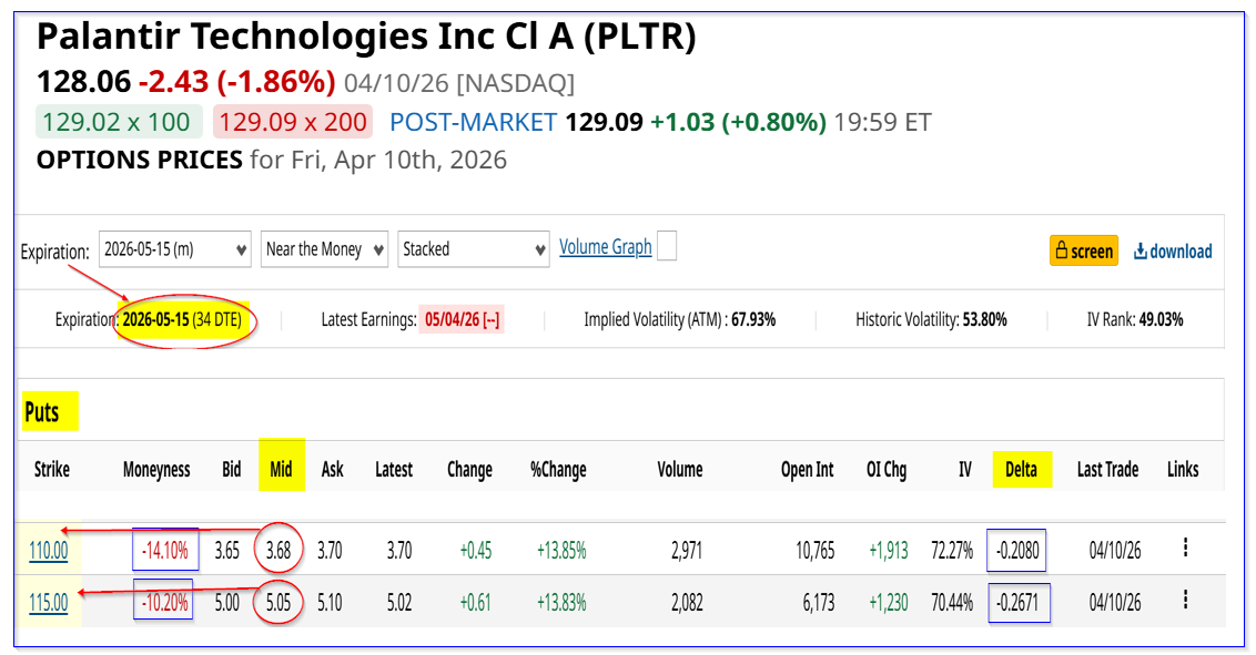Both of these contracts have low delta ratios - 26.7% and 20.8%, respectively, implying a low chance that PLTR will fall to these strike prices. But even if it does, the investor's account will have low breakeven points (i.e., $115 - $5.05, or $109.95, and $110 - $3.68, or $106.32).