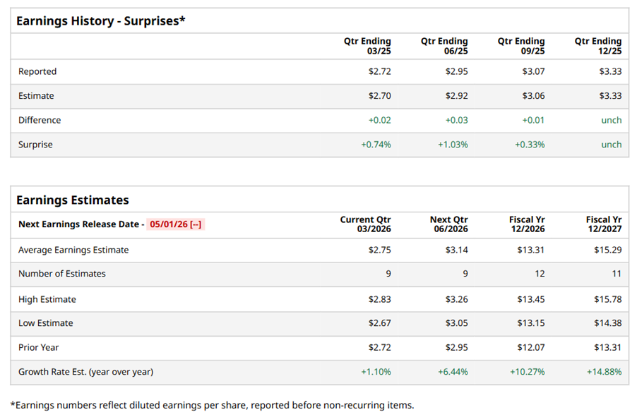 Eaton Corporation plc (ETN), headquartered in Dublin, Ireland, is a global power management company, manufacturing engineered products for the industrial, vehicle, construction, commercial, and aerospace markets. Valued at $156.4 billion by market cap, the company provides electrical components, hydraulic systems, aerospace products, vehicle components like transmissions and hybrid power systems as well as electric vehicle solutions. The power management giant is expected to announce its fiscal first-quarter earnings for 2026 in the near term.