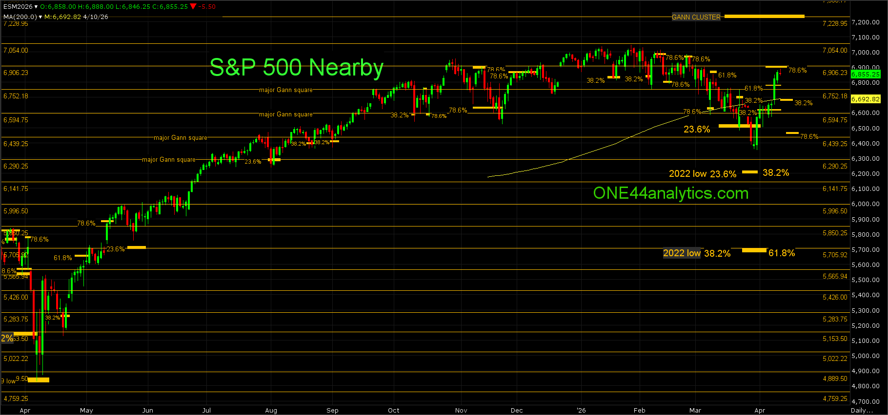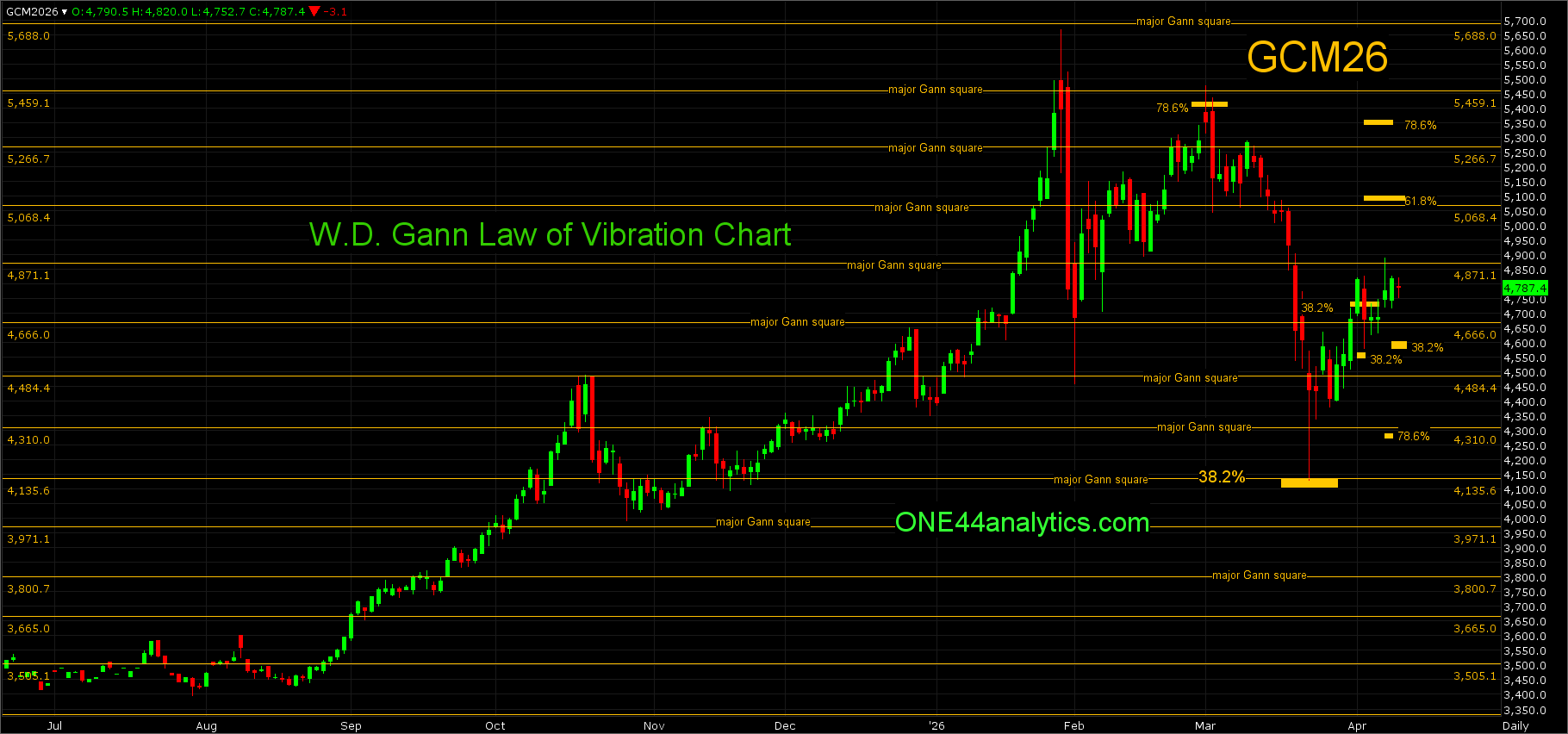 Below it, the longer term target is 78.6% back to the 3/23/26 low at 4290.00. The long term target on a failure to hold 38.2% back to the 2022 low at 4135.00 will be 61.8% of the same move at 3210.00. Before then there are major Gann squares to look for support and then use as the swing point when closed below, they are on the chart. Any setback that holds 38.2% back to the 3/23/26 low keeps the short term trend extremely positive and a new high can follow (ONE44 38.2% rule).