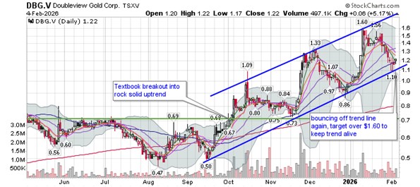 On the U.S. listing, DBLVF has mirrored the pattern, adjusted for currency exchange, with its own January high of $1.17 and current consolidation suggesting the next directional move within the established upward trend.