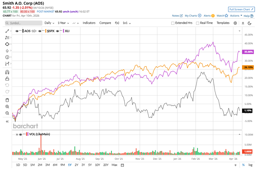 AOS stock has underperformed the S&P 500 Index’s ($SPX) 29.4% gains over the past 52 weeks, with shares up 4.9% during this period. Similarly, it underperformed the State Street Industrial Select Sector SPDR ETF’s (XLI) 38.9% gains over the same time frame.