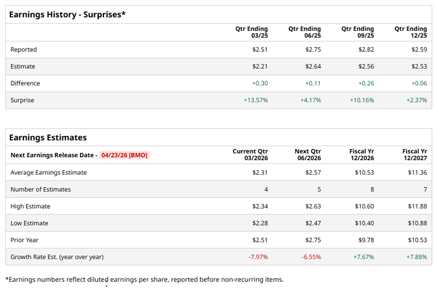 Charlotte, North Carolina-based Honeywell International Inc. (HON) provides aerospace technologies, control and security solutions for commercial buildings, industrial automation, and process technology for the energy transition. Valued at $149.4 billion by market cap, its business is aligned with three powerful megatrends - automation, the future of aviation, and energy transition, underpinned by its Honeywell Accelerator operating system and Honeywell Forge IoT platform. The diversified industrial conglomerate is expected to announce its fiscal first-quarter earnings for 2026 before the market opens on Thursday, Apr. 23.