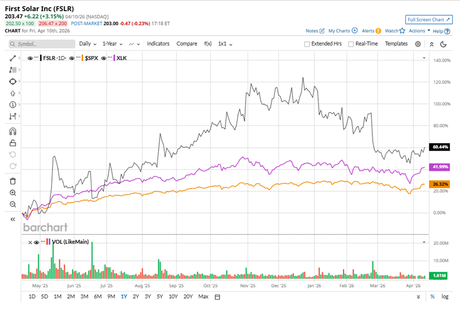 FSLR stock has outperformed the S&P 500 Index’s ($SPX) 29.4% gains over the past 52 weeks, with shares up 66.5% during this period. Similarly, it outperformed the State Street Technology Select Sector SPDR ETF’s (XLK) 46.8% returns over the same time frame.