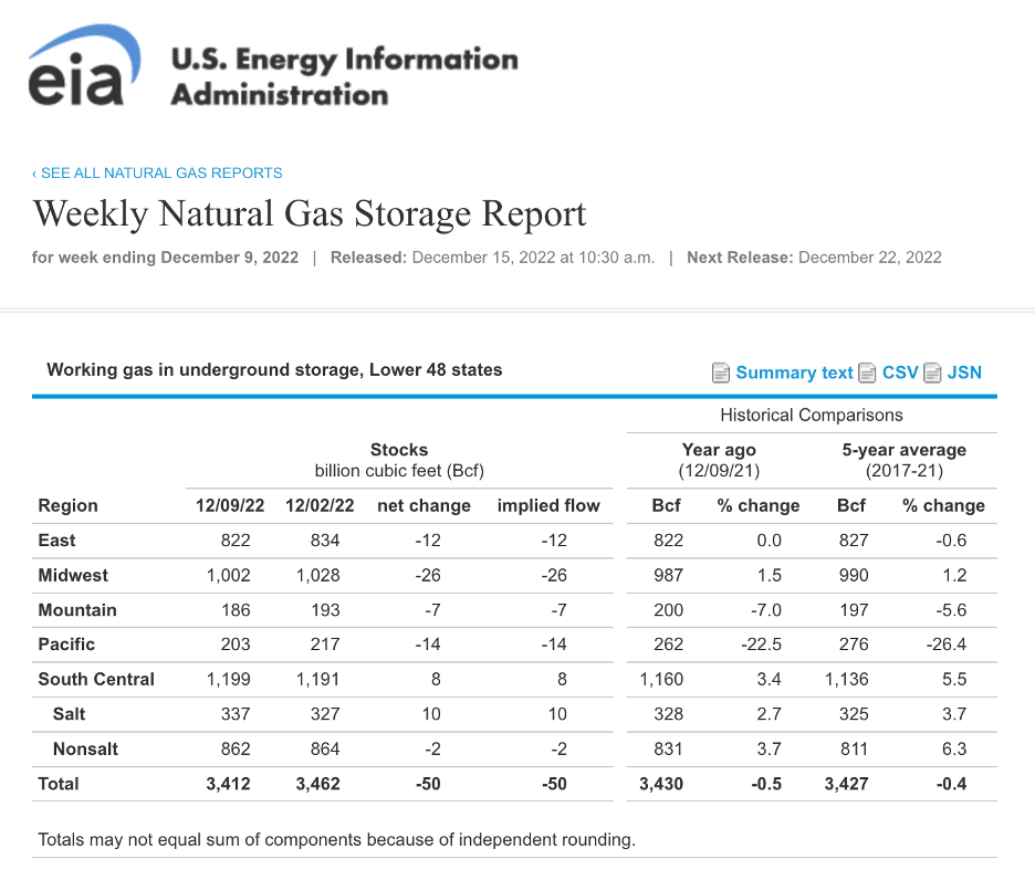 The chart shows that at 3.412 trillion cubic feet in storage across the U.S., natural gas inventories were 0.5% below last year’s level and 0.4% under the five-year average for the week ending on December 9, 2022. While the stockpiles are stable for U.S. consumers, the global demand landscape has dramatically changed for the 2022/2023 winter, with European prices at record highs and availability at low levels.