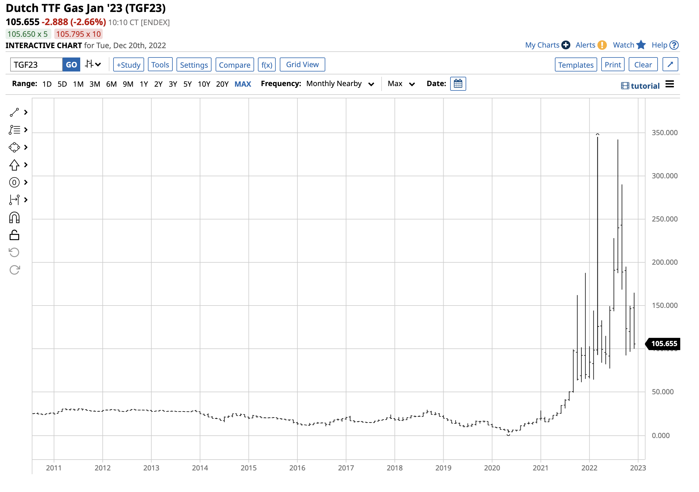 In the Netherlands, the natural gas price rose to a record peak in March 2022. At over the 105 level on December 20, natural gas remains at a record high compared to pre-2021 prices.
