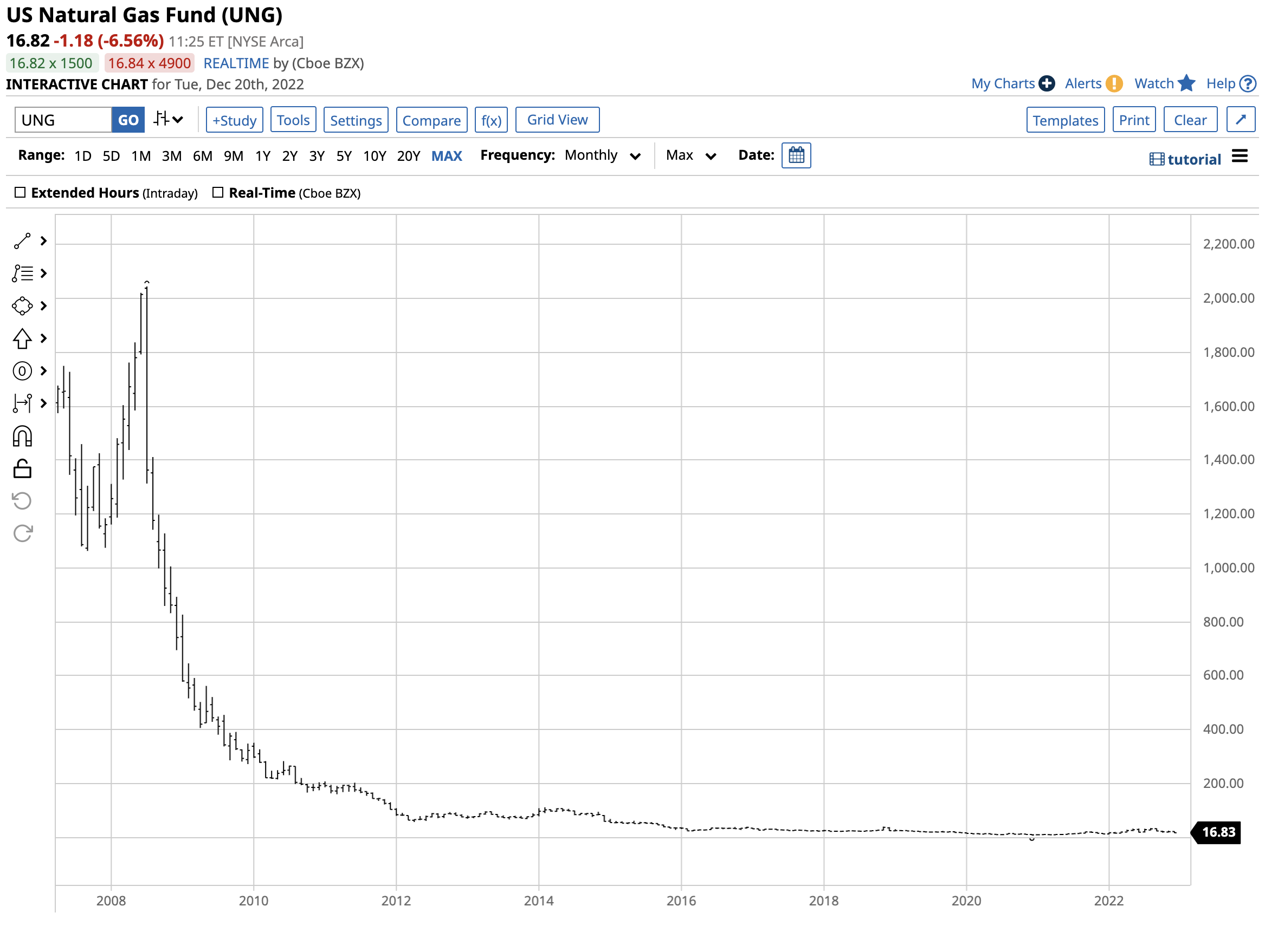 The long-term chart shows that while UNG rose from $8.89 in June 2020 to $16.82 on December 20, a 89.2% rise, nearby natural gas prices moved from $1.44 to $5.40, or 275% over the period. UNG is not appropriate for long-term investors.