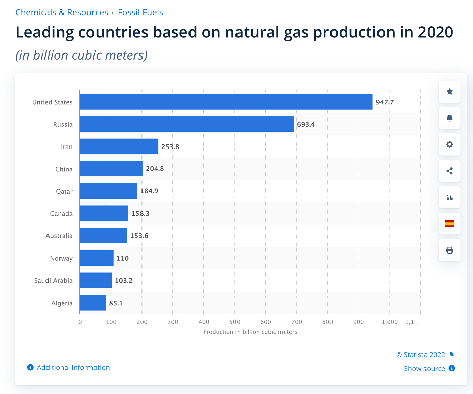 While the U.S. leads the world in natural gas output, Russia is the second-leading producer.