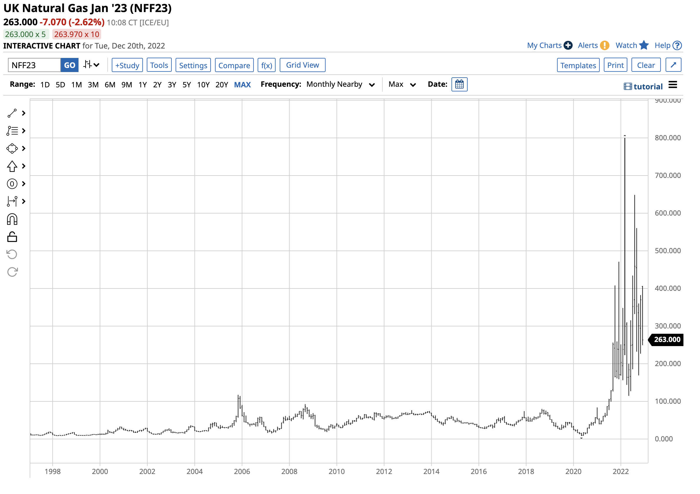 The chart shows U.K. natural gas futures exploded to a record high in March 2022. At just below the 265 level on December 20, U.K. natural gas remains significantly above the pre-2021 117 high.