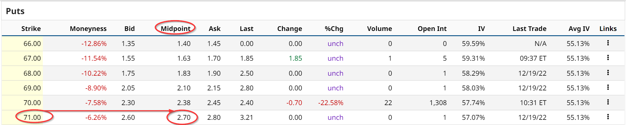 For example, the $71.00 strike price puts trade for $2.70, as seen in the Barchart option chain below.